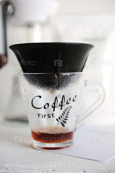 Альтернатива ручному завариванию кофе в пористом керамическом безбумажном фильтре-капельнице. Ручная кофемолка на заднем плане