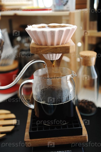 Заваривание кофе в розовой керамической капельнице оригами с байпасом. Деревянная подставка. Альтернативное ручное заваривание