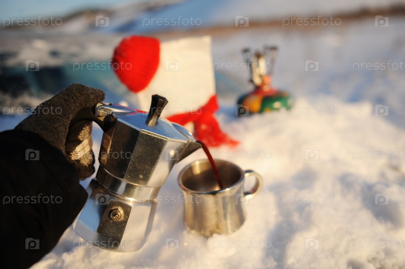 Кофе заваривается в кастрюле мока на газовой горелке на багажнике автомобиля под открытым небом в зимнем снежном пейзаже