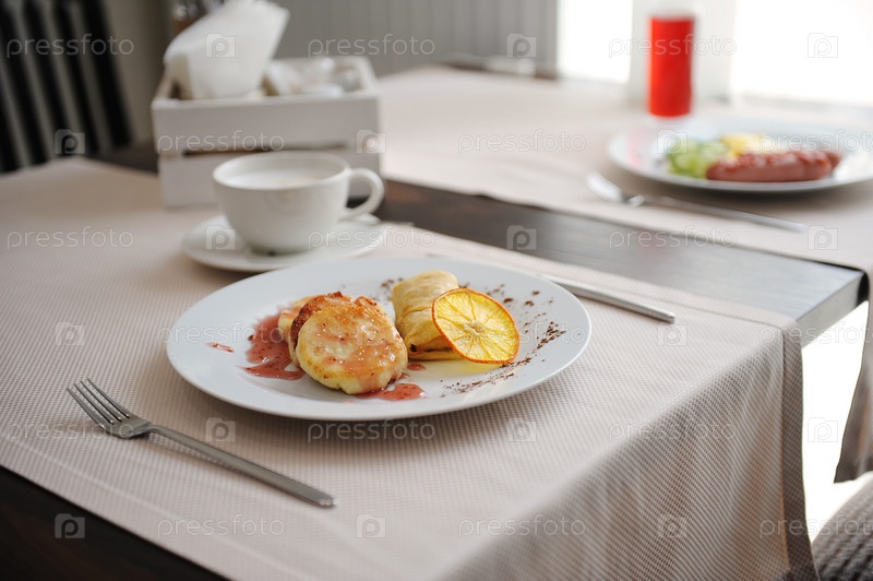 Подали завтрак в ресторане. Сырники с апельсиновыми колечками и кофе