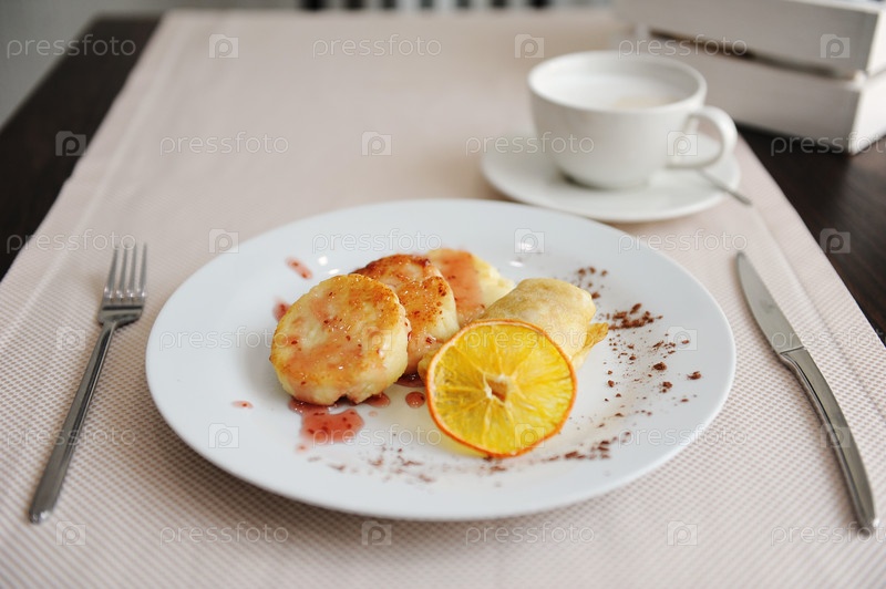 Подали завтрак в ресторане. Сырники с апельсиновыми колечками и кофе