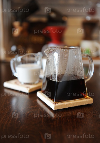 Черный кофе в стеклянном кувшине. Молоко с кокосовым молоком. Устройства для ручного заваривания кофе на заднем плане