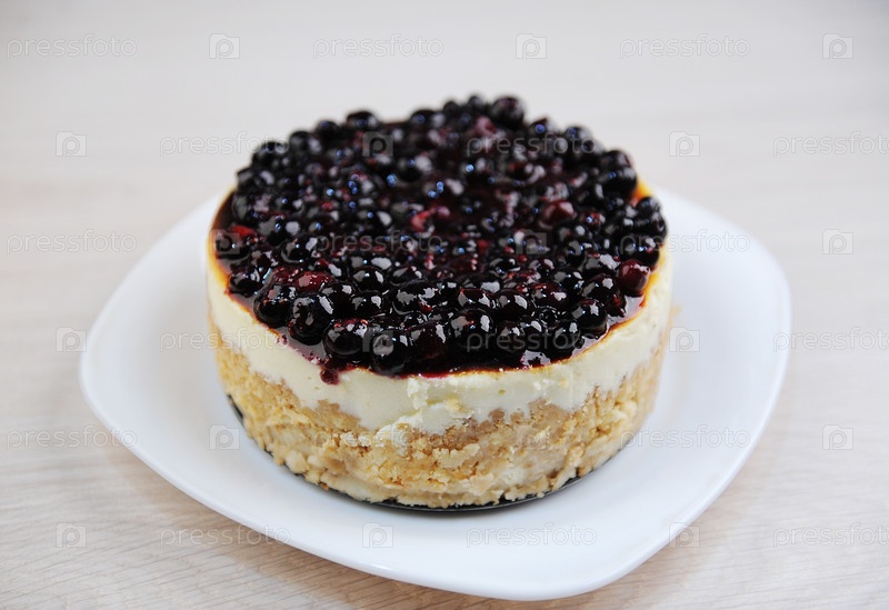 Целый черничный чизкейк на белой тарелке