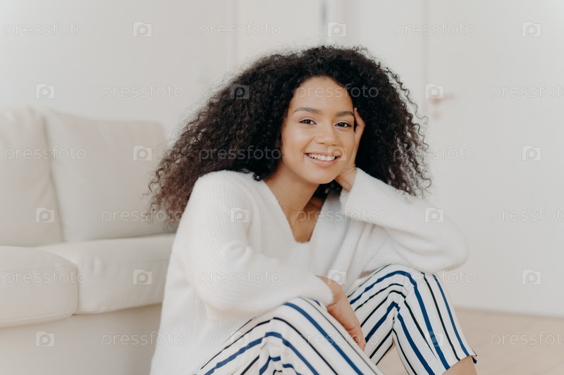 Фотография расслабленной и восхищенной афроамериканки с кудрявой прической, нежно улыбающейся в камеру, в белом свитере и полосатых брюках, сидящей на полу возле дивана в гостиной современной квартиры