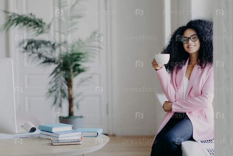 Позитивная афроамериканка-бизнесмен сидит на подоконнике, держит кружку кофе, одета в формальную одежду, позирует возле рабочего стола с книгами, зеленым комнатным растением на заднем плане, отдыхает