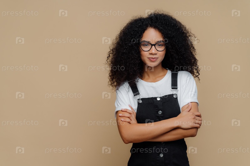 Фотография красивой темнокожей девочки-подростка, которая позирует со скрещенными руками, носит очки, белую футболку и черный сарафан, стоит на коричневом фоне, копирует место для вашего рекламного контента