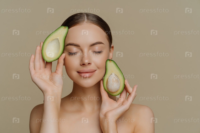 Портрет нежной здоровой женщины держит глаза закрытыми, имеет чистую освеженную кожу, держит авокадо для косметического продукта, проходит косметические процедуры, стоит с голыми плечами, изолированными над бежевой стеной