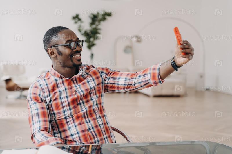 Счастливый афро-мужчина звонит по телефону по видеосвязи и разговаривает с другом. Консультация или корпоративная встреча