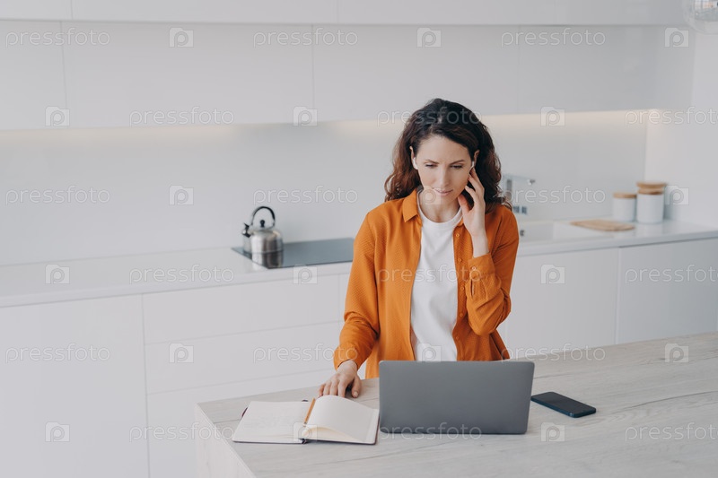 Удаленный учитель проводит занятия через зум дома. У учителя есть конференция с использованием наушников и ноутбука. Счастливая европейская женщина проводит конференцию на кухне. Электронное обучение и онлайн-школа на карантине