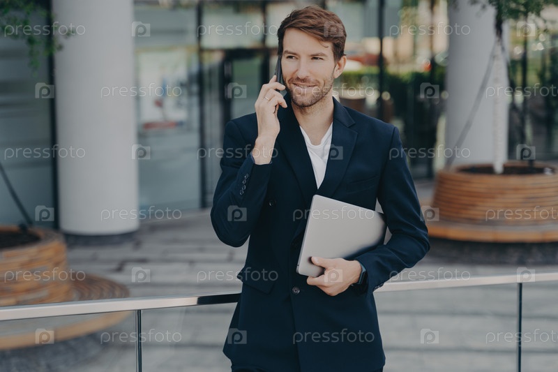 Исполнительный менеджер в официальной одежде разговаривает по телефону на улице
