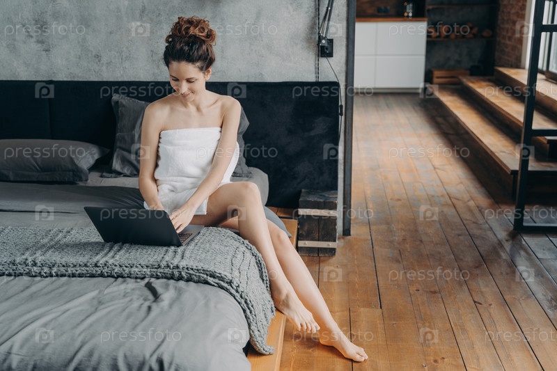 Выходные фрилансера. Привлекательная европейская женщина, завернутая в полотенце после купания, сидит за ноутбуком на своей кровати. Молодая женщина принимает душ и отдыхает дома. Образ жизни удаленного работника