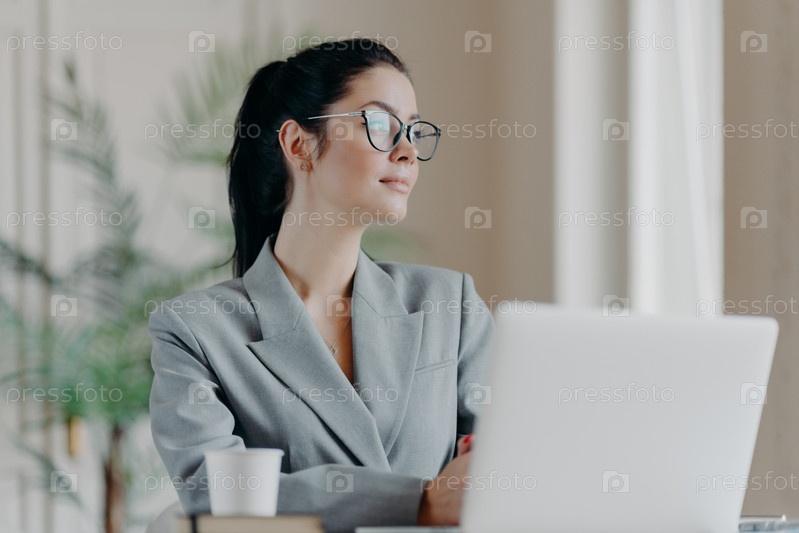 Успешная брюнетка-предприниматель собирается смотреть вебинар через ноутбук, сосредоточена в стороне с задумчивым выражением лица, носит прозрачные очки, одета в формальную одежду, пьет кофе
