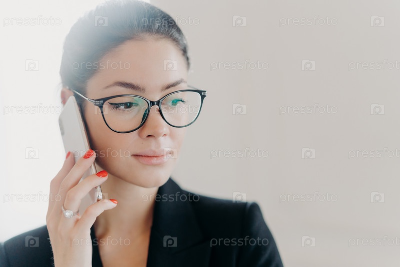 Снимок головы серьезной брюнетки-менеджера с макияжем в модных очках, официальной одежде, с красным маникюром, звонит деловому партнеру во время удаленной работы, позирует в помещении на белом фоне