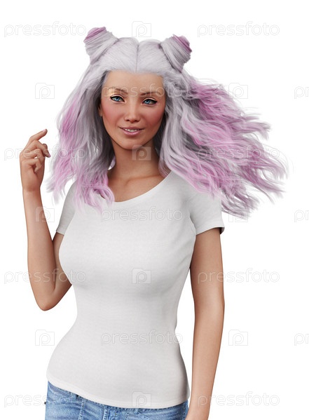 3D Девушка с розово-белыми волосами в белой рубашке