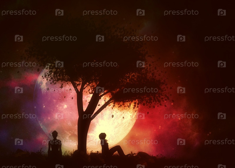 Девушка под силуэтом дерева и полнолунием