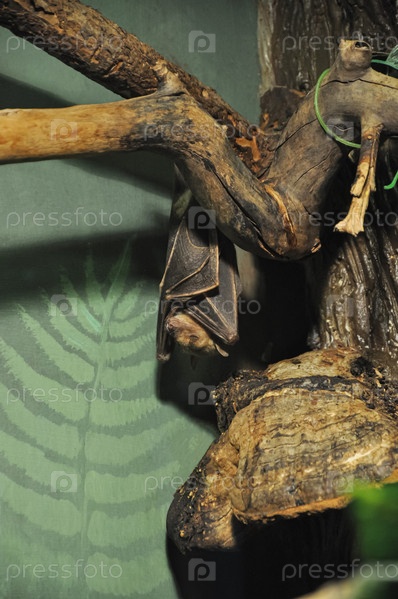 Летучая мышь. Летучая мышь спит на дереве. Коричневая летучая мышь. Террариумное животное. Зоопарк животных