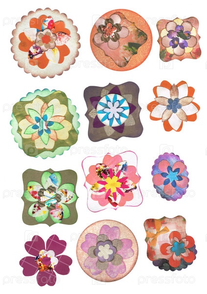 Элементы для скрапбукинга. Отдельные детали на белом фоне. Бумажные украшения для коллажей. Круги и звезды. Красивый декор для скрапбукинга