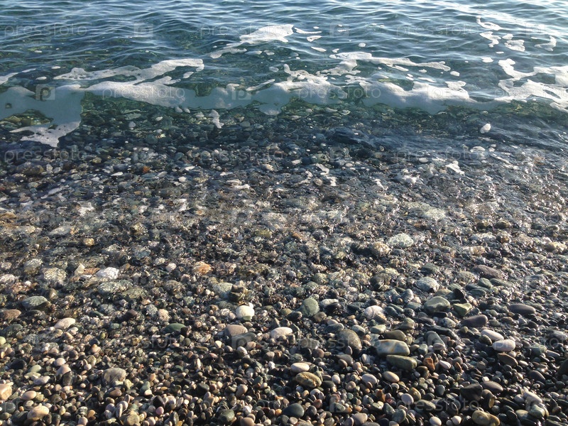 Морская стоимость. Морские волны. Песчаный берег. Прилив воды. Синие волны. Природа. Мелкие камни на берегу
