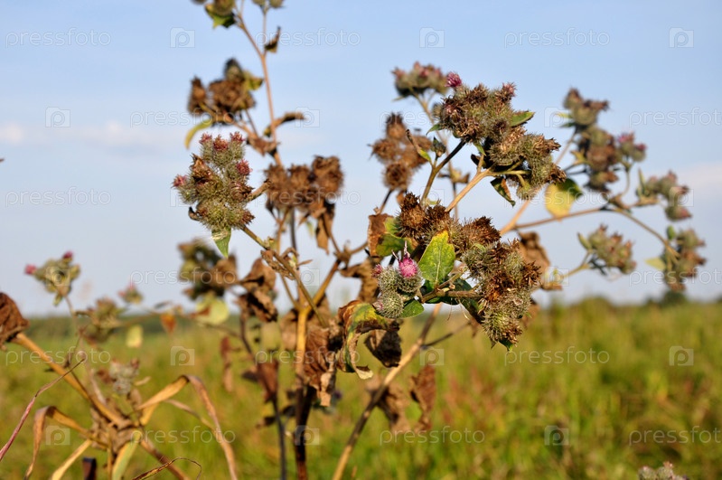 Лопух. Сухой лопух. Цветы и листья лопуха на фоне неба. Растения в поле. Сухие дикорастущие травы