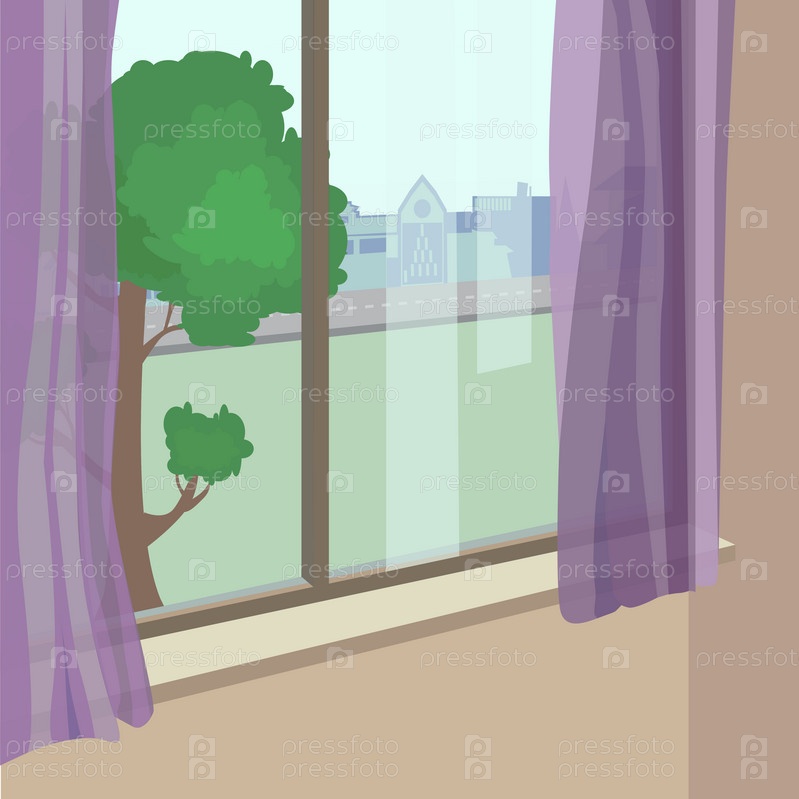 Иллюстрация с окном на улицу. Окно с занавесками. Окно с видом на улицу. Город и дерево в окне. Комната с окном. Интерьер комнаты. Стена в комнате