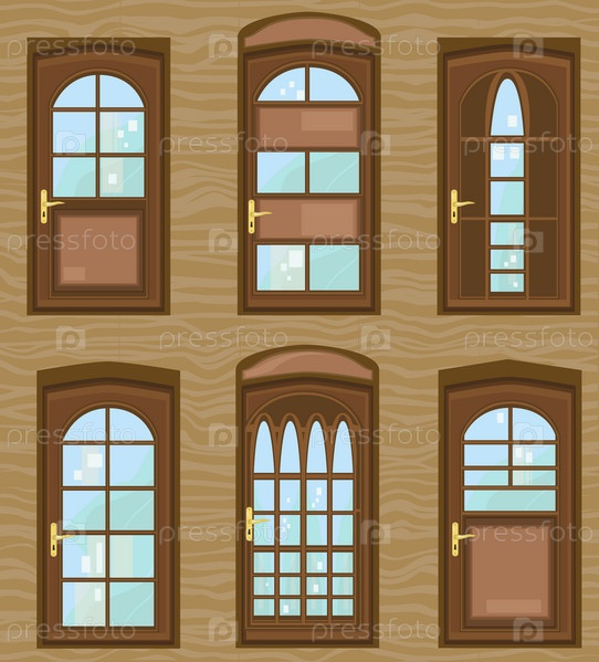 Большой набор красивых дверей. Коллекция дверей. Дизайн входной двери. Входные двери на деревянном фоне. Иллюстрация. Части зданий и домов. Разные двери