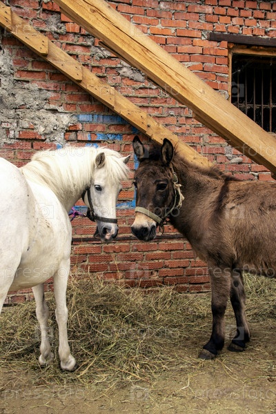 Белый пони и красный мул стоят вместе возле кирпичной стены конюшни