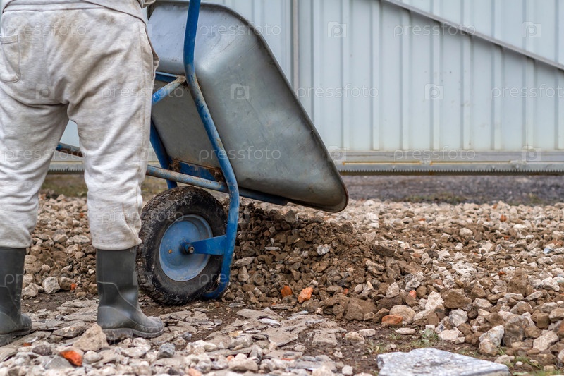 Мужчина везет тележку с щебнем. Распределение щебня на дороге
