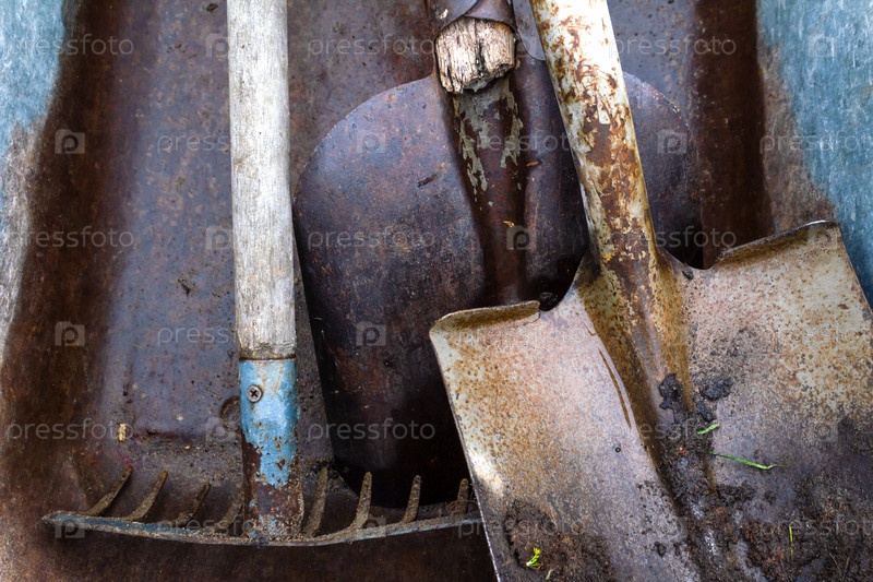 Садовый инвентарь: лопаты, грабли лежат в тележке