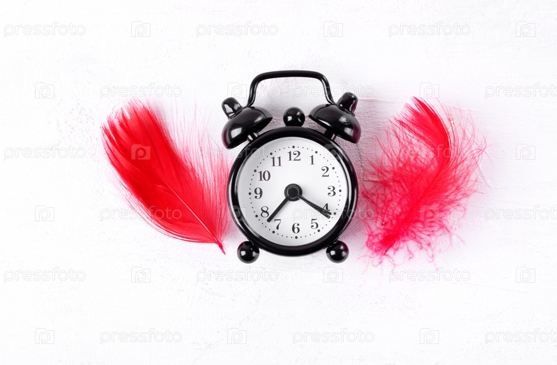 Будильник и красные перья на белом фоне. Концепция утра, пробуждения, спокойного ночного сна. Женское здоровье и регулярные месячные. Женская гигиена