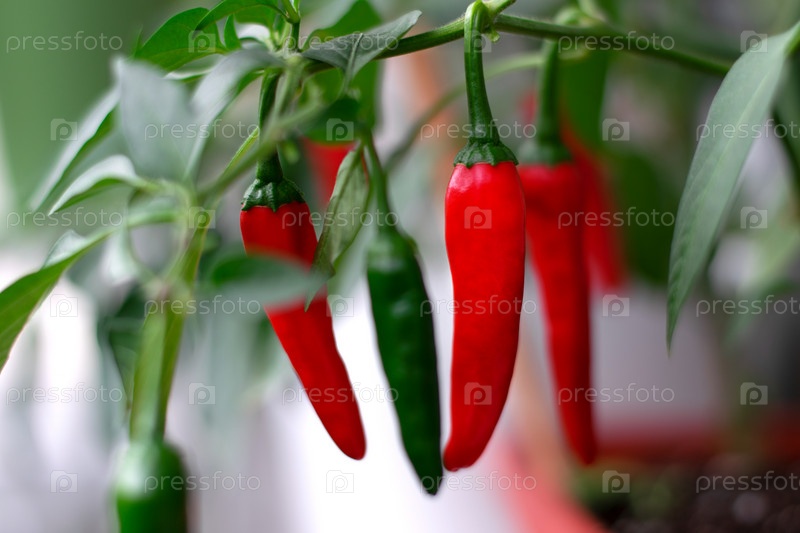Острый перец чили растет в горшке на подоконнике балкона. Куча спелых и незрелых стручков. Урожай на оконной ферме