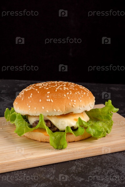 Бургер с говяжьей котлетой на деревянной тарелке на темном фоне