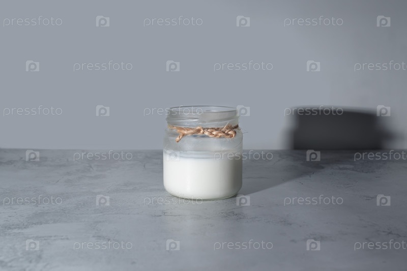 Стеклянная банка с молоком при дневном свете. Всемирный день вегетарианца. Без лактозы, многоразовая упаковка. Неаллергическое питание. Домашняя еда. Копировать пространство