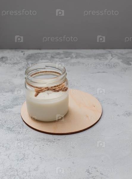 Молоко в стеклянной банке на деревянной доске. Всемирный день вегетарианца. Без лактозы, многоразовая упаковка. Неаллергическое питание. Домашняя еда. Копировать пространство