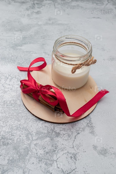 Вегетарианское молоко и палочки корицы на деревянной доске. Альтернативные напитки для осени, осеннего сезона. Органическая домашняя еда. Без лактозы