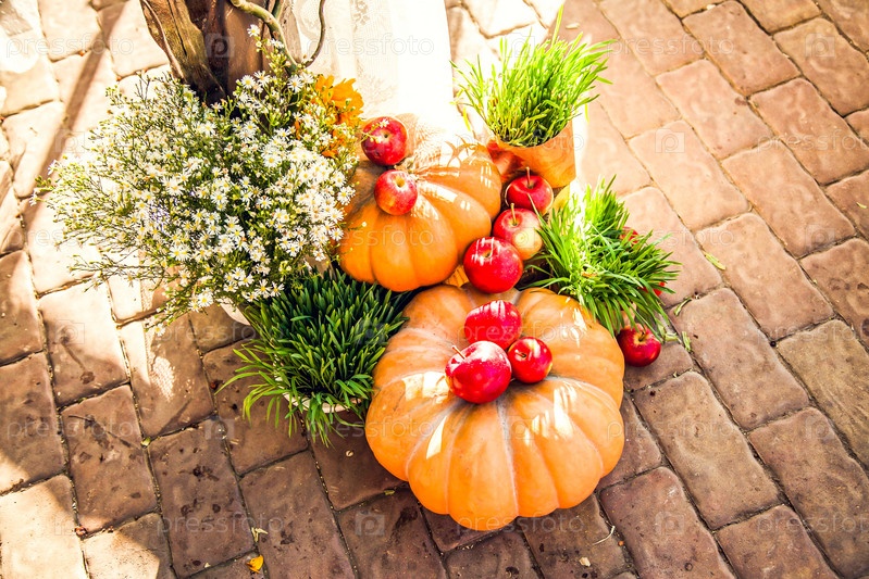 Свадебная арка для выездной свадебной церемонии, оформленная в осенней тематике тыквами