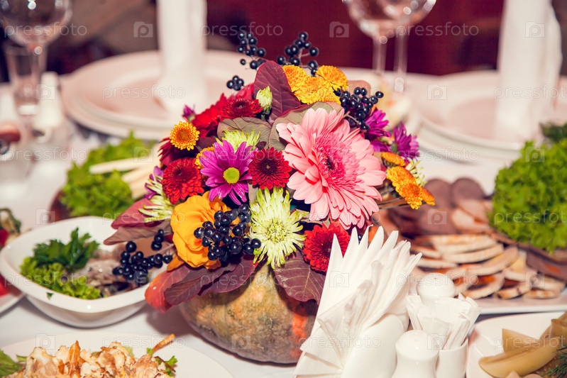 Осенний свадебный декор в деревенском стиле с цветами и тыквами на столах гостей в ресторане на праздничном банкете