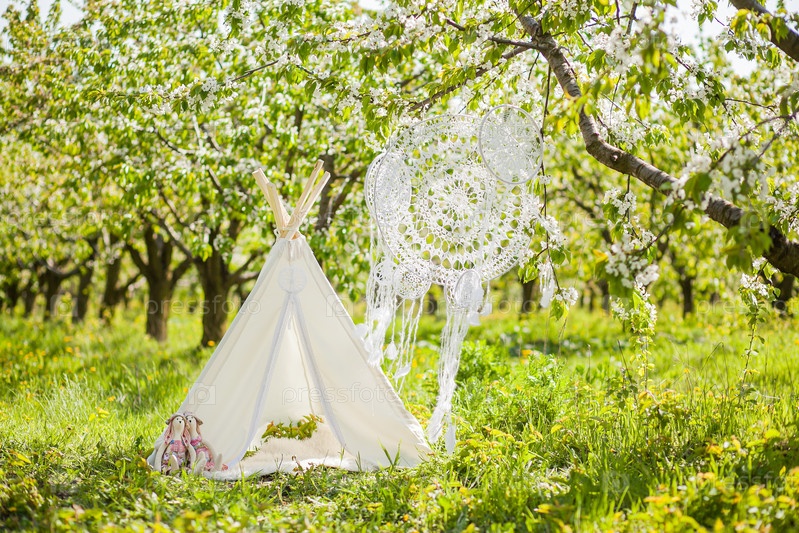Фотозона для детской фотосессии в цветущем саду - вигвам, вязаные крючком ловцы снов и игрушки кролики