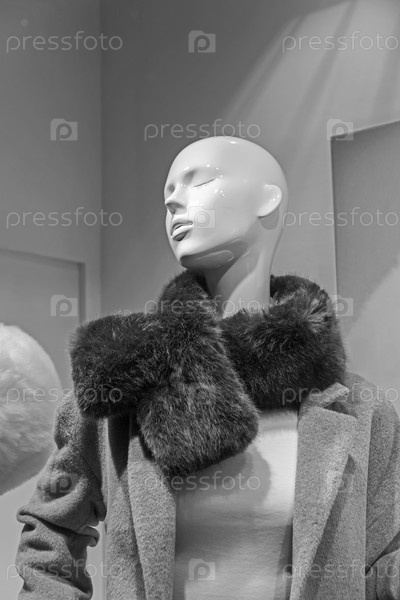 Витрина дорогого магазина одежды. Манекен с меховой горжеткой. Париж, Франция. Черно-белый вариант