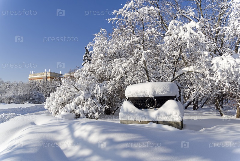 Заснеженный сквер перед Главным зданием МГУ. между физическим и химическим факультетами. Солнечный день в феврале