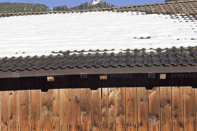 Снег на крыше дома тает в солнечный мартовский день