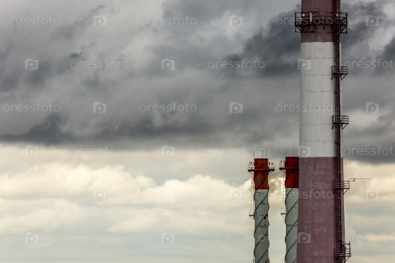 Загрязнение воздуха в городской среде, крупный план крупных промышленных труб