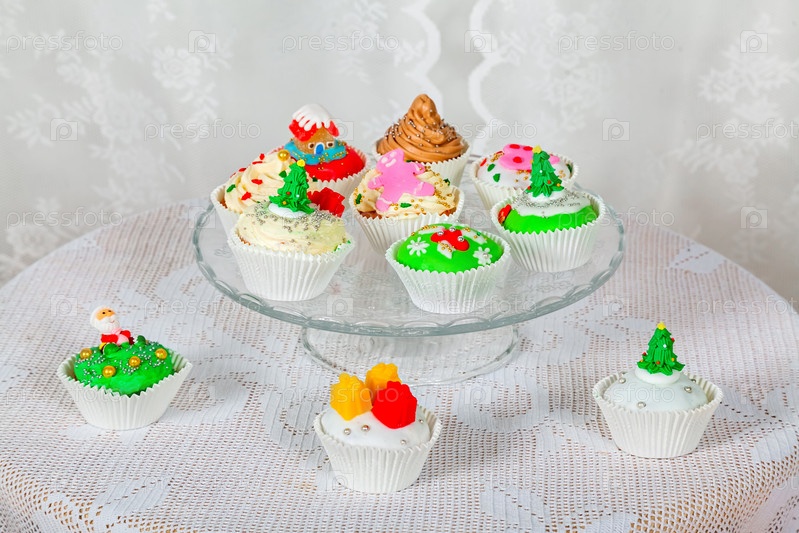 Стеклянная подставка с домашней выпечкой, капкейками, маффинами, оформленная в рождественском стиле. Сезонные праздничные рождественские мини-десертные кексы в традиционных декоративных символах