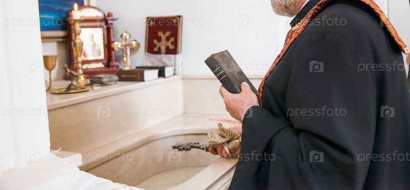 Армянский священник с крестом и библией совершает обряд крещения над купелью