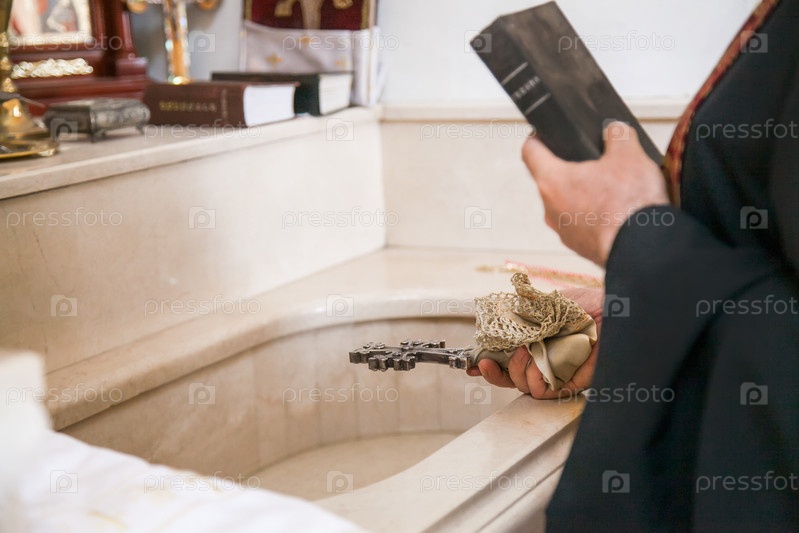 Армянский священник с крестом и библией совершает обряд крещения над купелью
