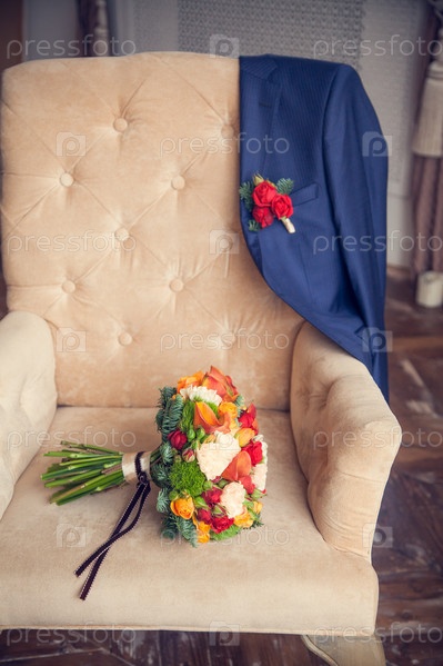Букет невесты и жакет жениха с бутоньеркой на старинном мягком кресле в спальне