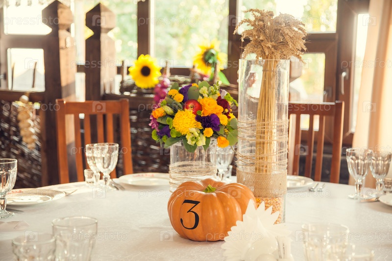 Праздничная флористика в осеннем стиле с нумерацией столов на тыквах в банкетном зале