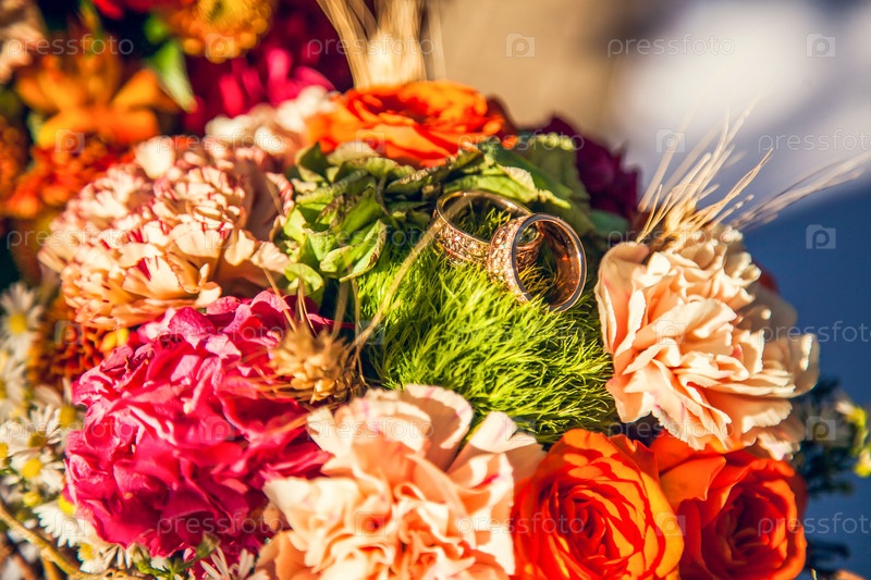 Обручальные кольца на букете невесты в осенней тематике