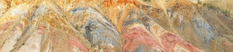 Красочные холмы в Республике Алтай под названием Марс 2. Фон окружающей среды, панорамный вид. Естественная цветная текстура марсианского ландшафта из песчаника в горах Алтая