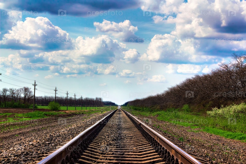 Железнодорожные пути уходящие вдаль среди весенних полей