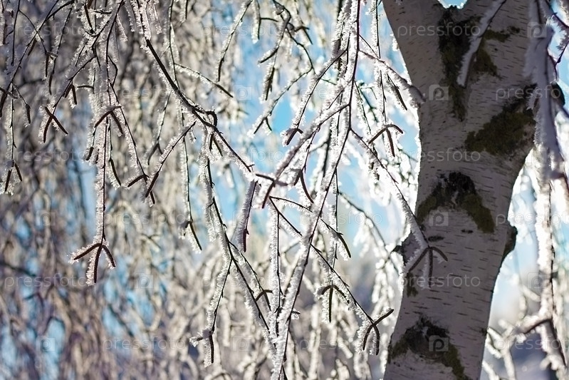 Заснеженные ледяные ветки березы крупным планом